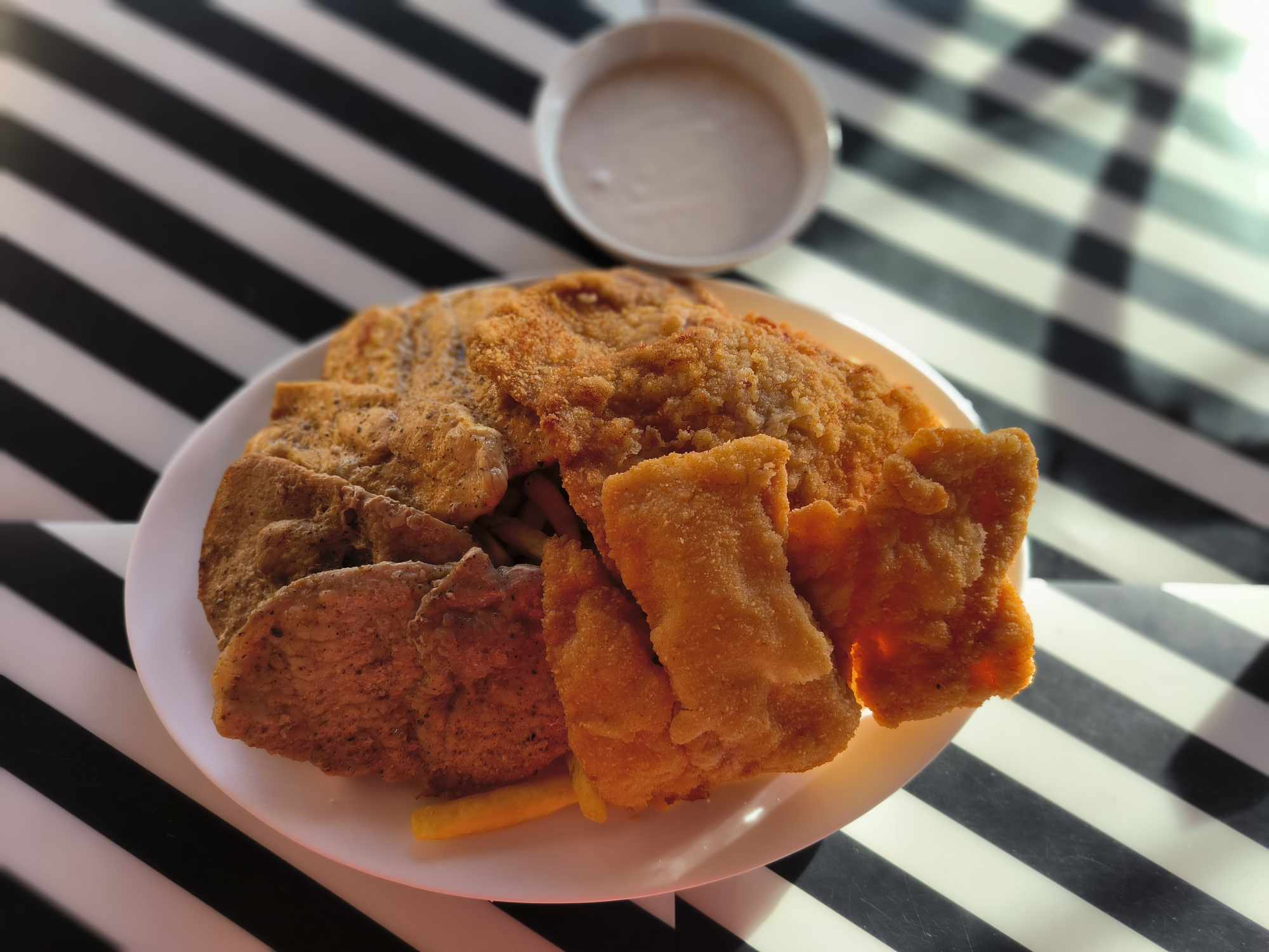 Full húsos tál 2 személyre(Rántott csirkemell, rántott karaj, grillezett csirkemell, natúr karaj, hasáb, tartár)